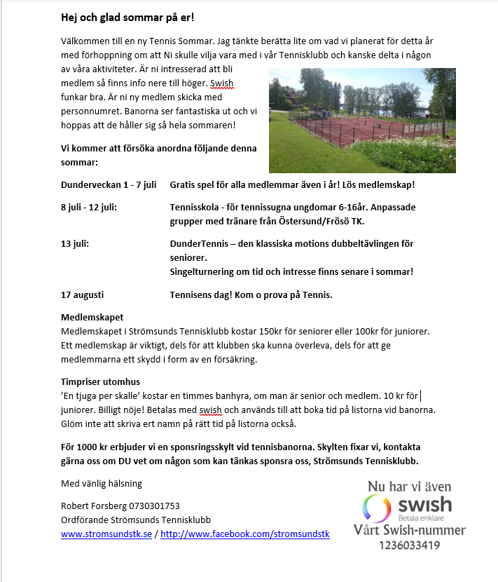 Hej och glad sommar på er! Välkommen till en ny Tennis Sommar. Jag tänkte berätta lite om vad vi planerat för detta år med förhoppning om att Ni skulle vilja vara med i vår Tennisklubb och kanske delta i någon av våra aktiviteter. Är ni intresserad att bli medlem så finns info nere till höger. Swish funkar bra. Är ni ny medlem skicka med personnumret. Banorna ser fantastiska ut och vi hoppas att de håller sig så hela sommaren! Vi kommer att försöka anordna följande denna sommar: Dunderveckan 1 - 7 juli Gratis spel för alla medlemmar även i år! Lös medlemskap! 8 juli - 12 juli: Tennisskola - för tennissugna ungdomar 6-16år. Anpassade grupper med tränare från Östersund/Frösö TK. 13 juli: DunderTennis – den klassiska motions dubbeltävlingen för seniorer. Singelturnering om tid och intresse finns senare i sommar! 17 augusti Tennisens dag! Kom o prova på Tennis. Medlemskapet Medlemskapet i Strömsunds Tennisklubb kostar 150kr för seniorer eller 100kr för juniorer. Ett medlemskap är viktigt, dels för att klubben ska kunna överleva, dels för att ge medlemmarna ett skydd i form av en försäkring. Timpriser utomhus ’En tjuga per skalle’ kostar en timmes banhyra, om man är senior och medlem. 10 kr för juniorer. Billigt nöje! Betalas med swish och används till att boka tid på listorna vid banorna. Glöm inte att skriva ert namn på rätt tid på listorna också. För 1000 kr erbjuder vi en sponsringsskylt vid tennisbanorna. Skylten fixar vi, kontakta gärna oss om DU vet om någon som kan tänkas sponsra oss, Strömsunds Tennisklubb. Med vänlig hälsning Robert Forsberg 0730301753 Ordförande Strömsunds Tennisklubb www.stromsundstk.se / http://www.facebook.com/stromsundstk Strömsunds Tennisklubb 3 jun 2024 0kommentarer